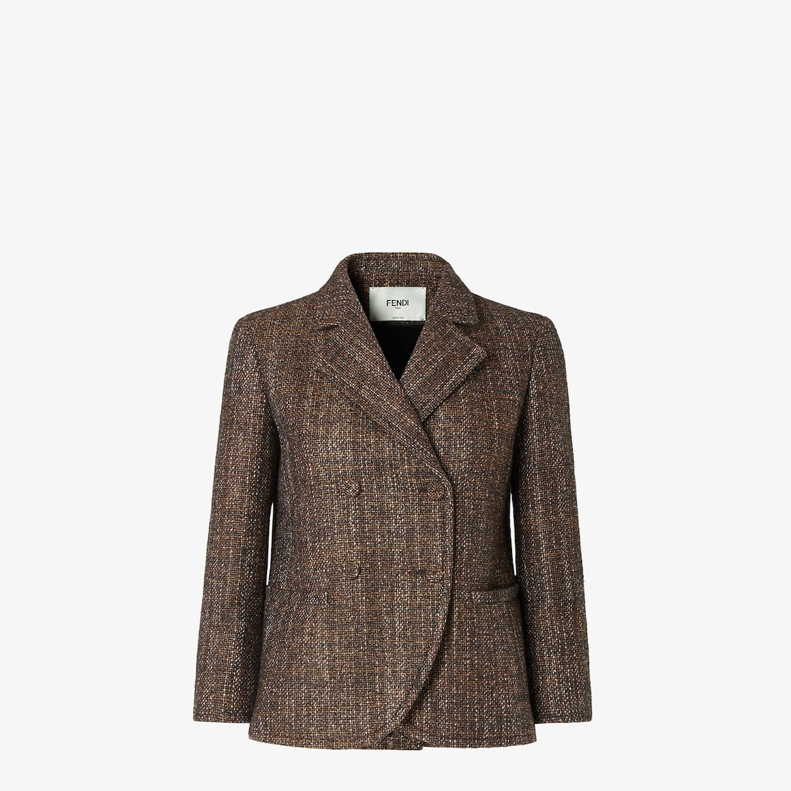 Double-breasted short jacket with 3/4 sleeves. Lapels and welt pockets on the front. Covered button closure in matching tone. Unlined. Made of rust-colored melange wool and alpaca tweed. Made in Italy Composition: 100% viscose, 43% wool, 40% alpaca, 17% polyamide, 4 buttons: mother of pearl, 2 buttons: 100% horn Size worn: 38 IT. The model is 180 cm tall Product Code: FJ7641AYN5F1T6K