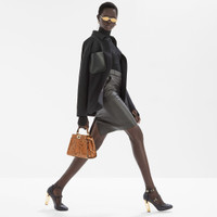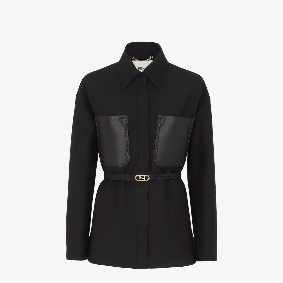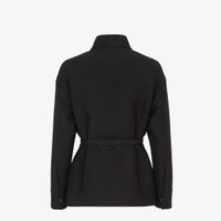 Single-breasted Go-To Jacket with shirt collar and low-cut set-in sleeves. Matching belt with metal Fendi O’Lock buckle. Oversized patch pockets on the chest. Made of black wool and silk. The leather pockets are finished with a raised Selleria stitching motif. Made in Italy Composition: 77% wool, 23% silk, lining: 100% viscose, sleeve lining:100% silk, belt 100% silk, 100% brass, 67% polyester, 33% polyurethane, pockets 100% lamb leather Fit: Over Size worn: 38 IT. The model is 180 cm tall Product Code: FJ7262AC4GF0GME