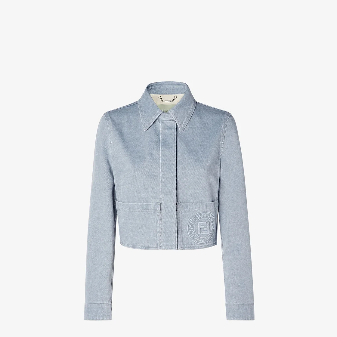 Long-sleeved crop jacket with shirt collar and cuffs. Patch pockets on the front. Concealed snap closure. Made of light blue denim. Customized with a Fendi Stamp 1925 patch on the front-left pocket. Made in Italy Composition: 100% cotton, lining: 69% viscose, 31% polyester Size worn: 38 IT. The model is 178 cm tall Product Code: FLF811ASMBF1RX3