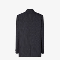 Slightly elongated double-breasted blazer. Peak lapel collar, long sleeves and breast pocket. Welt pockets with front flap. Covered button closure in matching tone. Made of black wool with a Fendi pinstripe motif. Can be worn with the classic double-breasted closure or fastened with the central button alone for a more relaxed fit. Made in Italy Composition: 80% wool, 20% viscose, lining: 100% cupro, 4 buttons: mother of pearl, 2 buttons: 100% horn Product Code: FJ7685AW7IF0QG3