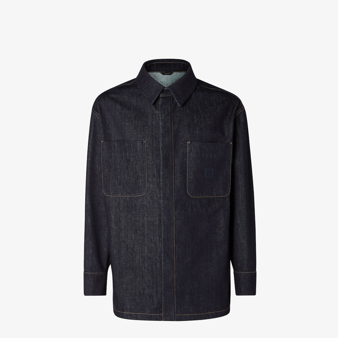 Straight-cut, long-sleeved jacket. Pointed collar and slightly dropped shoulders. Patch pockets on the chest and side welt pockets. Snap closure. Made of dark blue denim fabric. Customized with contrasting stitching, tone-on-tone Selleria topstitching and FF logo embroidered on the left pocket. Made in Italy Composition: 100% cotton Size worn: 48 IT. The model is 186 cm tall Product Code: FW1321AUAGF1RXI