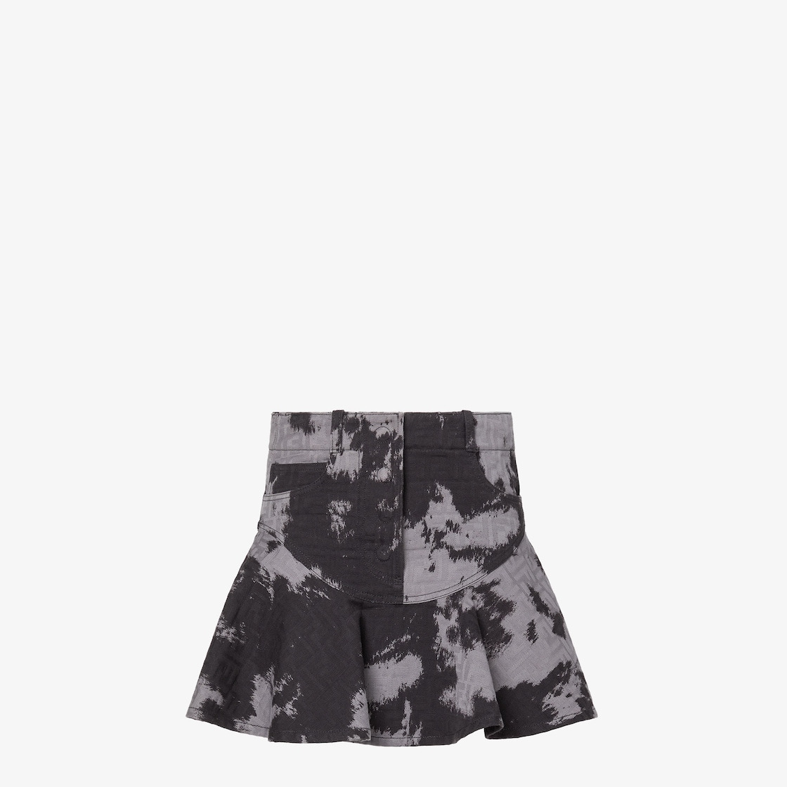 High-waisted A-line skirt. Five-pocket style with belt loops at the waist. Front closure with four visible covered buttons in the same color. Made of jacquard denim with the iconic FF motif and an all-over Frosted Fauna print: a nuanced reinterpretation of the timeless animalier in black and gray, inspired by an archive coat by Silvia Venturini Fendi. Finished with a Fendi Roma leather label applied to the waist on the back. Made in Italy Composition: 100% cotton Size worn: 38 IT. The model is 180 cm tall Product Code: FLQ602AVF5F0GME