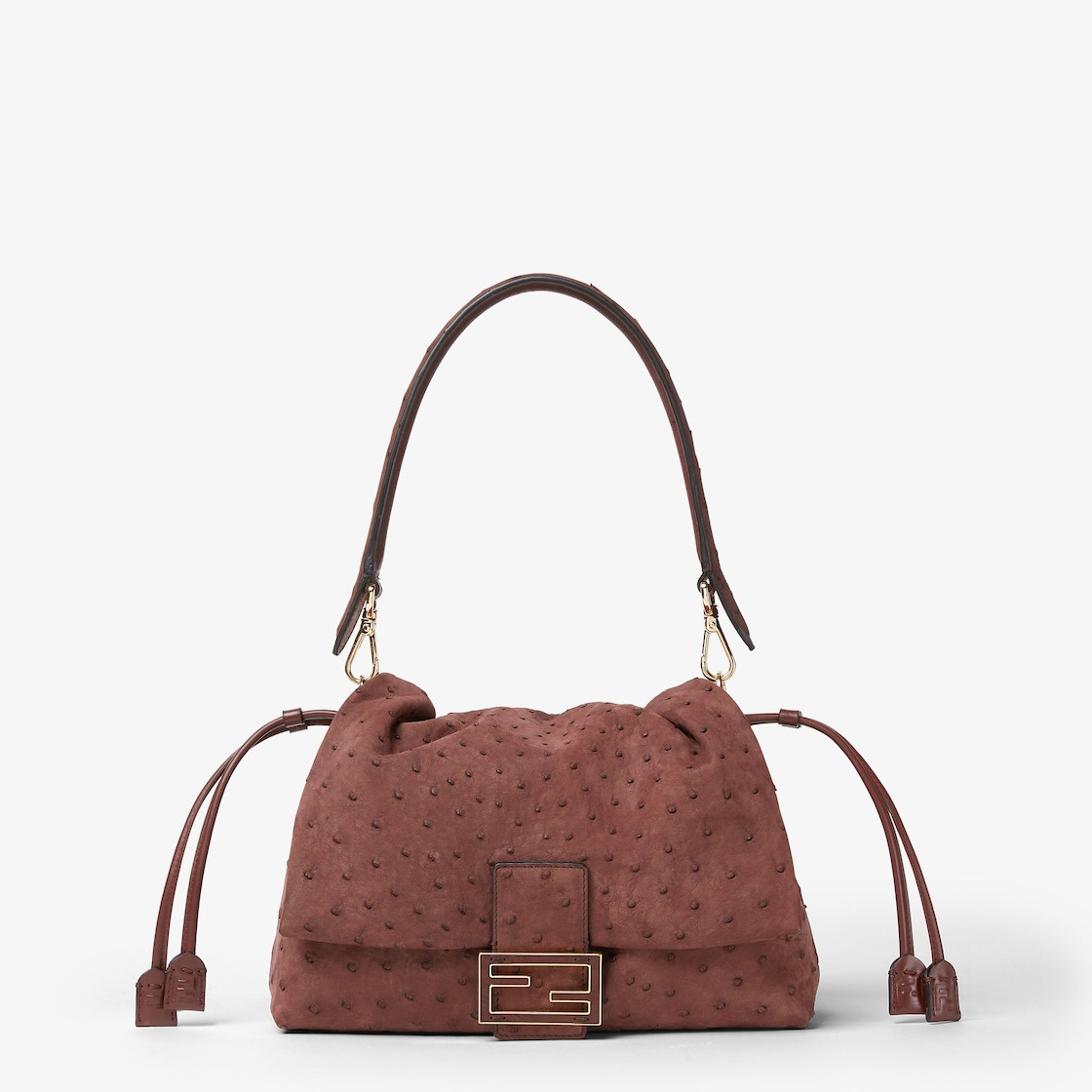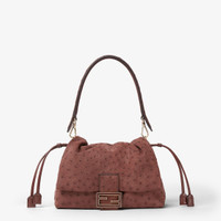 Iconic medium Mamma Baguette bag, created in the late 1990s as a larger version of the iconic Baguette, hence the name Mamma Baguette. Updated for the Spring/Summer 2025 fashion show with a soft, deconstructed look, it retains the original elements of the bag and the iconic under-the-arm design. Made of premium green ostrich leather with suede finish, decorated with an FF clasp with tone-on-tone leather insert. Large internal compartment lined in soft, tone-on-tone nappa leather, with drawstring closure with tone-on-tone nappa leather laces and customized details. Featuring a front flap and magnetic clasp. Gold-finish metalware. The bag can be worn either on the shoulder or cross-body thanks to the handle and shoulder strap, both detachable. Made in Italy Composition: 100% ostrich leather, inside: 100% calf leather Product Code: 8BR833AV53F1TDJ