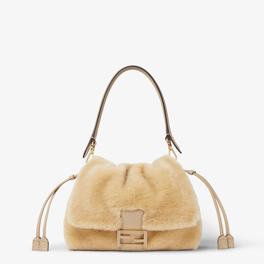 Iconic medium Mamma Baguette bag, created in the late 1990s as a larger version of the iconic Baguette, hence the name Mamma Baguette. Updated for the Spring/Summer 2025 fashion show with a soft, deconstructed look, it retains the original elements of the bag and the iconic under-the-arm design. Made of soft beige shearling, decorated with FF closure with beige leather insert. Large internal compartment lined in tone-on-tone suede with drawstring closure, with tone-on-tone soft nappa leather laces and customized details. Featuring a front flap and magnetic clasp. Gold-finish metalware. It can be carried on the shoulder or cross-body thanks to the handle and the beige nappa leather shoulder strap, both removable. Made in Italy Composition: 100% sheep fur, inside: 100% calf leather Product Code: 8BR833AYCUF0NGA