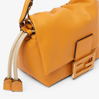 Iconic small Mamma Baguette bag, created in the late 1990s as a larger version of the iconic Baguette, hence the name Mamma Baguette. Updated for the Spring/Summer 2025 fashion show with a soft, deconstructed look while retaining the original elements of the bag. Made of soft, dark orange nappa leather, embellished with an FF clasp with tone-on-tone leather insert. Large suede-lined internal compartment with drawstring closure featuring beige leather cords and customized details. Featuring a front flap and magnetic clasp. Gold-finish metalware. Can be carried by hand or worn cross-body thanks to the handle and shoulder strap, both detachable. Made in Italy Composition: 100% lambskin, inside: 100% calfskin Product Code: 8BS105ABVEF0J29