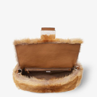Large, soft-shaped baguette made of dark beige long-haired shearling with a hand-shaded trompe-l'oeil effect that adds depth and movement to the soft texture. Square flap with FF clasp, magnetic button and brown Cuoio Romano leather. Fabric-lined interior with zip pocket and palladium-finish metalware. The bag can be carried by hand, worn over the shoulder or crossbody thanks to the Cuoio Romano leather handle and shoulder strap, both detachable. Made in Italy Composition: 100% sheep fur, 100% calf leather, inside: 90% polyester, 10% polyurethane Product Code: 7VA613AVCCF1TXG