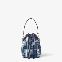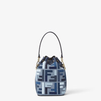 Iconic Mon Tresor bucket bag, distinguished by a timeless, compact and spacious silhouette. Made of blue canvas with FF motif in an embossed yarn embroidery in shades of blue. Trimmed with blue calfskin. Lined and with gold-finish metalware. Featuring a handle and adjustable and detachable shoulder strap in calfskin allowing the bag to be carried by hand, on the shoulder or cross-body. Holds a 6.7-inch smartphone, Mini Trifold card holder or wallet, keys and lipstick. Made in Italy Composition: 34% cotton, 27% polyamide, 22% polyurethane, 17% polyester, embroidery: 100% polyester, 100% calf leather, inside: 60% polyamide, 40% polyurethane Product Code: 8BS093AV11F1LAZ