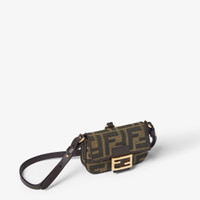 Nano version of the iconic Baguette bag, with flap and mini-FF clasp with magnetic closure. The clip allows it to be attached like a charm to larger bags or belts. It can also be carried under the arm or by hand thanks to the slender adjustable, detachable leather shoulder strap. Made of jacquard fabric with iconic FF motif. Details in brown leather. Gold-finish metalware. Made in Italy Composition: 65% polyester, 35% cotton, 100% calf leather, inside: 100% calf leather Product Code: 7AS414AFPMF1GL7