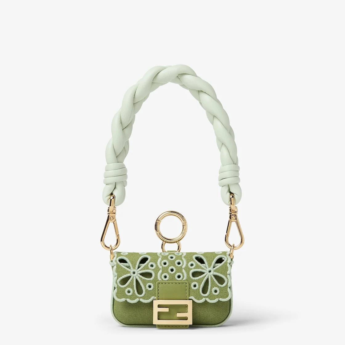 Iconic Nano Baguette bag with flap and mini FF clasp with snap button. The clip allows it to be attached like a charm to larger bags or belts. It can also be carried by hand thanks to the padded and braided leather maxi shoulder strap in light green. Made of green fabric with contoured flap and embellished by an openwork embroidery with light green yarn. Gold-finish metalware. Made in Italy Composition: 100% cotton, 100% lambskin, embroidery: 100% polyester Product Code: 7AS484AWR1F1VEY