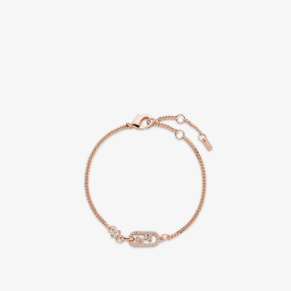 Fine chain bracelet with Fendi O'Lock motif. Adjustable clip closure. Made of metal with a rose-gold finish. Decorated with a champagne-colored pave crystals. Made in Italy Composition: 100% bronze, strass: 100% zircon Product Code: 8AH428A44GF15IG Product Care: The product you have purchased may be embellished with a precious metal top or varnish and may also feature appliques, gemstones (in various shades of the same color), crystals, plexiglass or resin. The mixture of materials and the special details give this product its unique character. To best maintain the product’s appearance over time, avoid contact with sea water, spa water, lacquers, perfumes, solvents, chemicals and abrasive materials. If necessary, clean with water and a neutral soap and/or polish with a dry microfiber cloth.