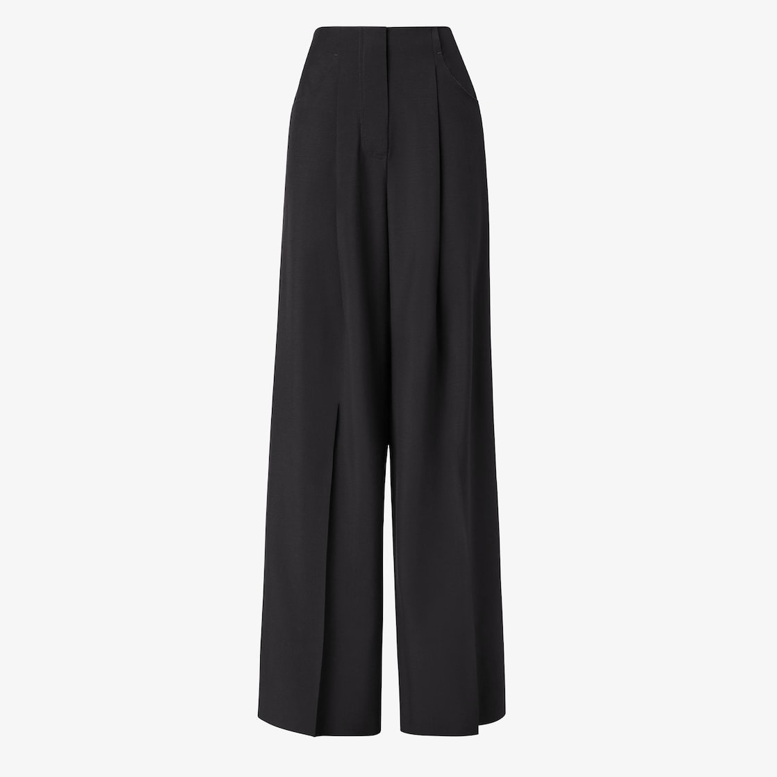 Wide leg pants. Hip pockets and pleats at the front waist. Front concealed zipper closure. Made of black wool and mohair. Made in Italy Composition: 75% wool, 25% mohair, fabric inner lining: 100% silk Size worn: 38 IT. The model is 180 cm tall Product Code: FR6655AQ3HF0GME