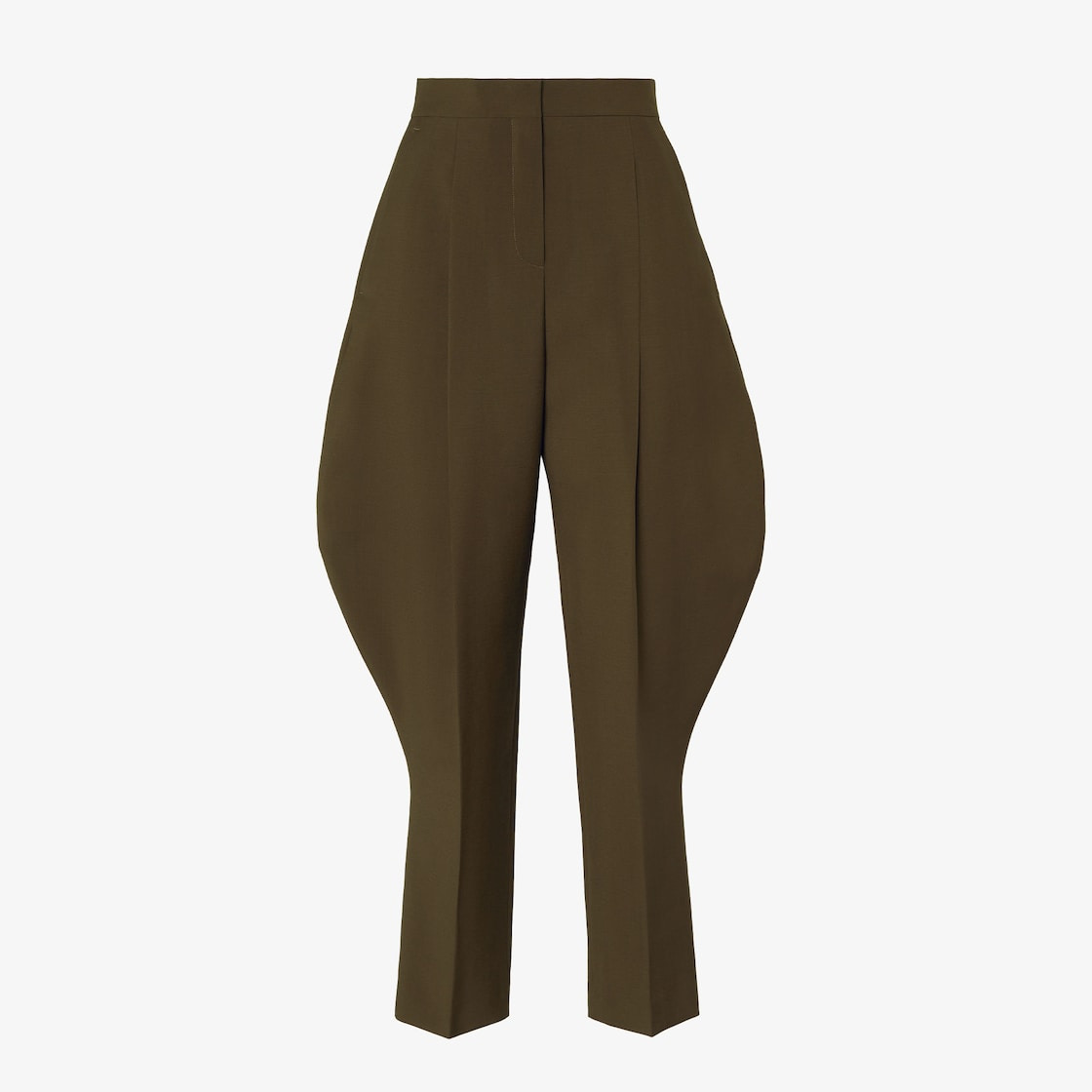 High-waisted riding pants with pleats at the front and cropped to above the ankle. Side pockets and front closure with covered zipper. Made of olive green wool and mohair. Made in Italy Composition: 75% wool, 25% mohair, fabric inner lining: 100% silk Product Code: FR6658AQ3HF1T6G