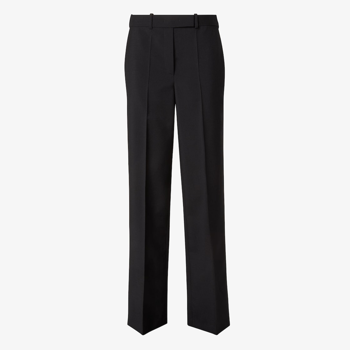 Wide leg palazzo pants. Tailored construction with hip pockets, pressed pleat and belt loops at the waist. Concealed zipper closure. Made of black wool and mohair. Made in Italy Composition: 75% wool, 25% mohair Product Code: FR6652AQ3HF0GME