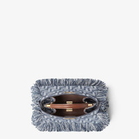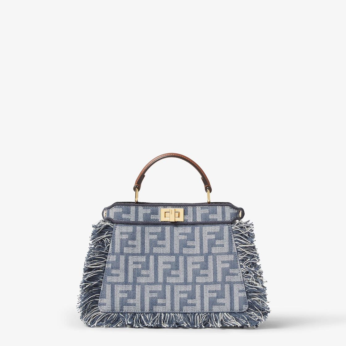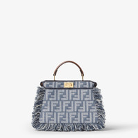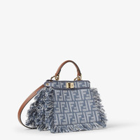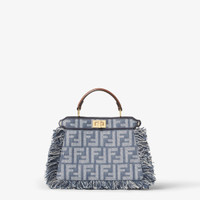 Iconic small Peekaboo ISeeU bag, the epitome of Fendi craftsmanship and creativity. A timeless icon, the Peekaboo was created in 2009. Like the children’s game it takes its name from, peek-a-boo, the bag plays with the beauty showcased on the outside and that concealed on the inside. Made of denim-effect FF jacquard in shades of blue and decorated with small fringes along the edges. Featuring a brown calfskin lining, two internal compartments divided by a stiff partition and internal pocket. Gold-finish bar, closure and metalware. Decorated with the iconic twist lock on both sides. The bag can be carried by hand or worn either on the shoulder or cross-body thanks to the handle and adjustable, detachable shoulder strap, both in brown leather. Made in Italy Composition: 34% cotton, 27% polyamide, 21% polyurethane, 18% polyester, 100% calf leather, inside: 100% lamb leather Product Code: 8BN335AUT4F1SXQ