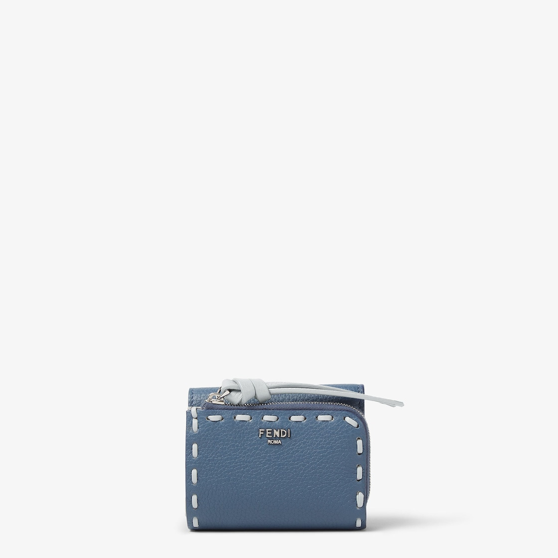 Compact Peekaboo tri-fold wallet, with a large internal compartment for bills, a cardholder slot and an external coin purse with a zipper and long knotted zipper pull. Made of blue Cuoio Romano leather with 82 hand-sewn, contrasting topstitches, an emblem of the iconic Selleria stitching handed down through generations of Fendi artisans since 1925. Palladium-finish metalware and metal FENDI logo. Made in Italy Composition: 100% calf leather, inside: 100% calf leather Product Code: 8M0499AURNF1SXX