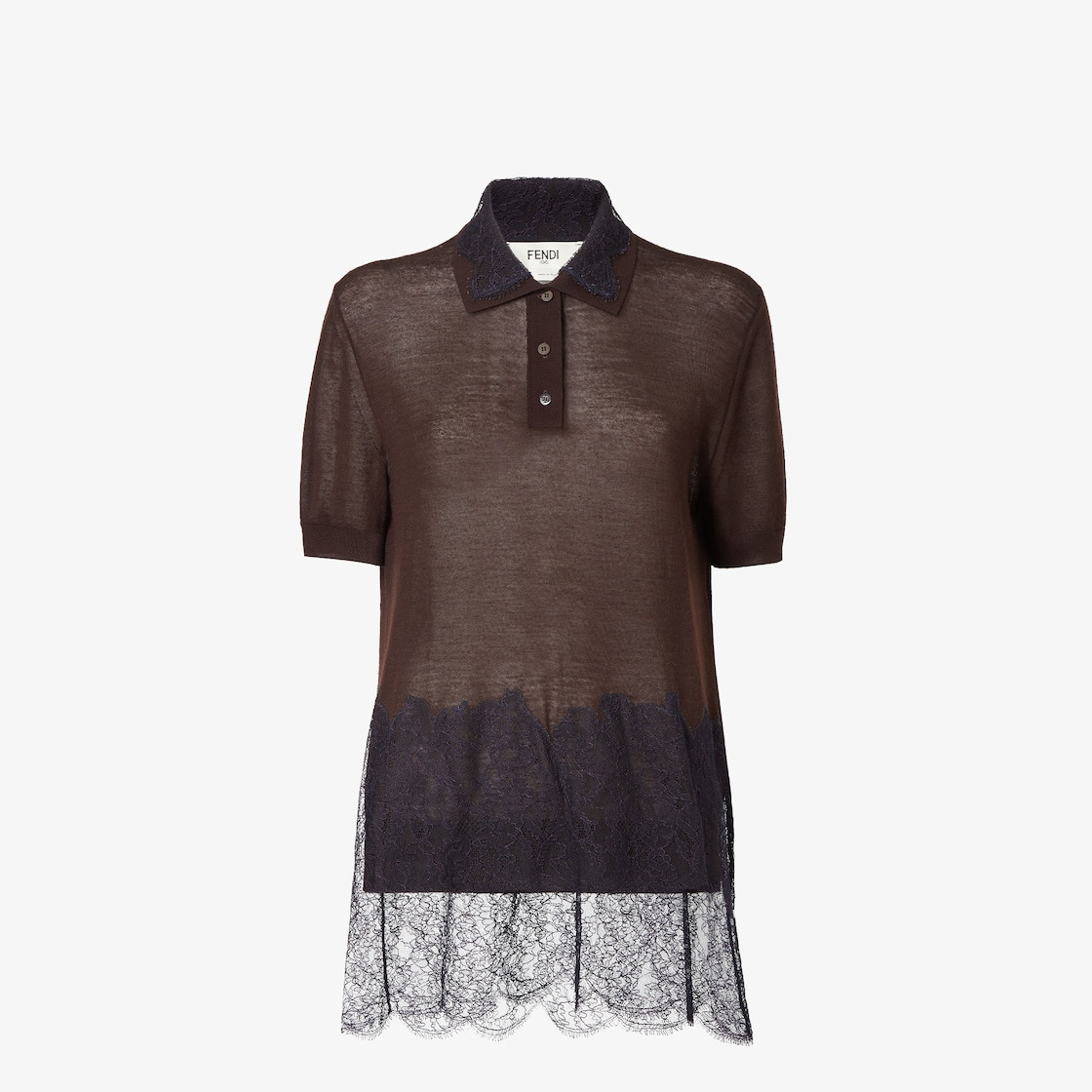 Short-sleeved polo shirt. This style has a classic collar closed with flat buttons. Made of a lightweight cashmere and silk knit in dark brown. Inspired by an archive design from 1968 and finished with a tone-on-tone lingerie-effect lace and tulle inserts. Made in Italy Composition: 70% cashmere, 30% silk, 4 buttons: mother of pearl Size worn: 38 IT. The model is 178 cm tall Product Code: FZXE00AUZSF1T6H