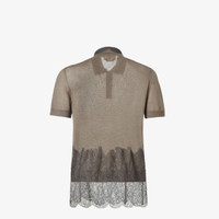 Short-sleeved polo shirt. This style has a classic collar closed with matching-color button. Made of dove gray cashmere yarn, with tone-on-tone lace appliques on the collar and hem. Finished with ribbed edges. Made in Italy Composition: 68% cashmere, 30% silk, 2% polyamide, 55% polyamide, 45% viscose, 4 buttons: mother-of-pearl Size worn: 48 IT. The model is 188 cm tall Product Code: FZC417AOZWF1UCH