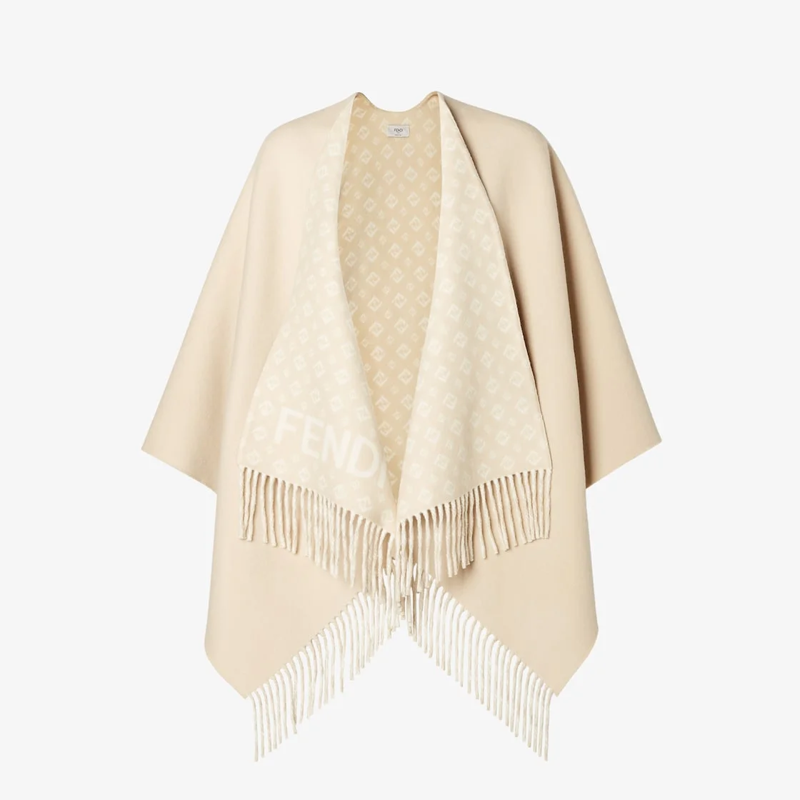 Large, enveloping poncho with fringed-edge finish. Made in a luxurious wool and cashmere blend double-sided fabric in a camelia color. The underside is customized with an eye-catching contrasting FF Diamonds motif all over and Fendi lettering on the hem. Made in Italy Composition: 90% fleece wool, 10% cashmere Product Code: FXX027AWEOF0NH8