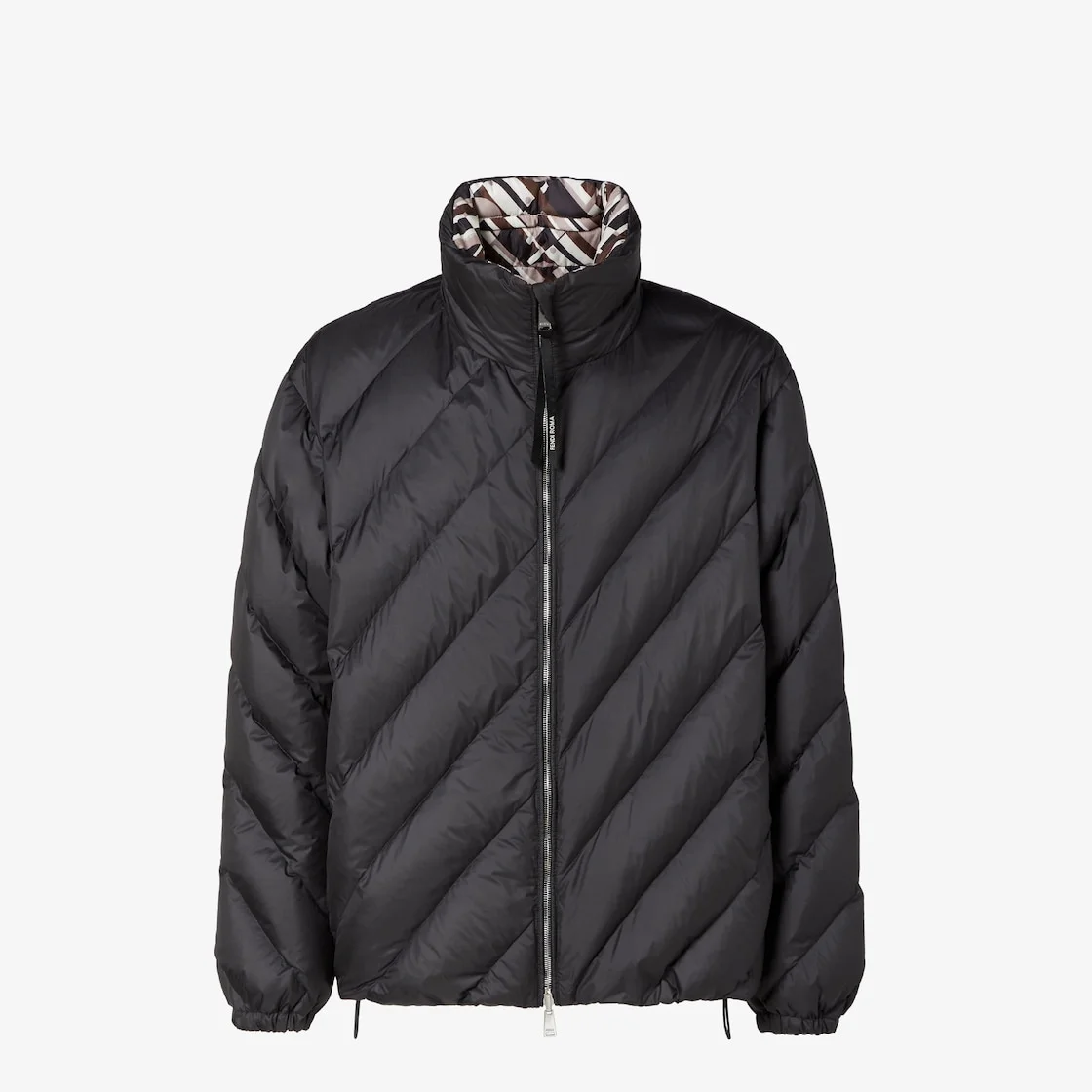 Long-sleeved down jacket with internal hood integrated in the high collar with zip. Elasticated cuffs and drawstring hem. Front closure with double-slider zipper. Made of black nylon with quilted Chevron and leather Fendi Roma patch on the back of the collar. The interior is customized with an all-over Fendi Tape print in various shades of brown. Palladium-finish metalware. Made in Italy Composition: 100% polyester, 100% calf leather parts, lining: 100% polyester, 90% down, 10% duck feathers Size worn: 48 IT. The model is 188 cm tall Product Code: FAA970AVIFF0GME