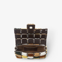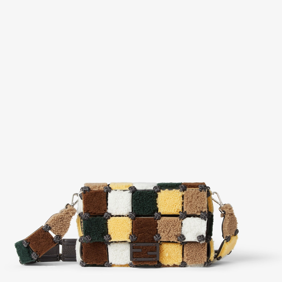 Baguette bag that innovatively combines Fendi’s craftsmanship and creativity with circular production. Made in a patchwork of multicolored shearling offcuts from previous Fendi collections. Each square is cut, finished and interwoven by hand with dark brown leather laces. Square leather flap with magnetic FF closure. Suede-lined interior with flat pocket. Palladium-finish metalware. Can be worn over the shoulder or cross-body thanks to the detachable patchwork shoulder strap. Made in Italy Composition: 100% sheep fur, 100% calf leather, inside: 90% polyester, 10% polyurethane Product Code: 7VA572AVAZF1TX9