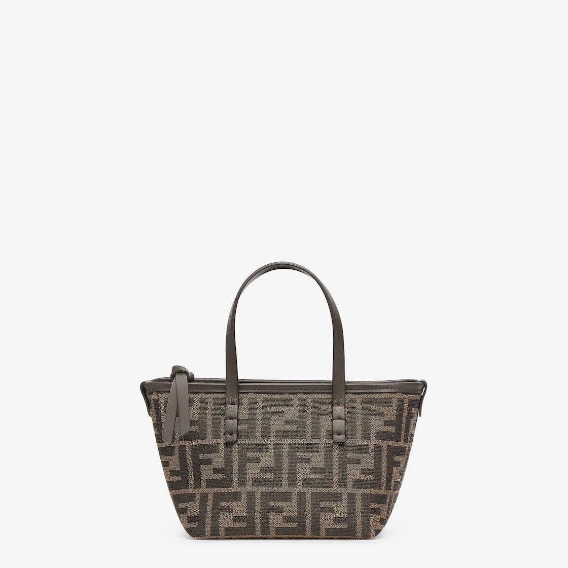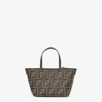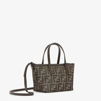 Mini shopping bag made of jacquard fabric with an iconic brown FF motif. Embellished with dark brown leather and a zip fastening with a long, knotted leather zip pull. Featuring an internal lined compartment and gold-finish metalware. The bag can worn on the shoulder or carried by hand thanks to the removable shoulder strap and beige leather handles, embellished with hand stitching. Made in Italy Measurements: - Height : 13 cm - Depth : 11 cm - Width : 15.5 cm - Weight : 0.25 kg - Strap length (min) : 113 cm - Strap length (max) : 117 cm - Shoulder strap drop : 54 cm Composition: 27% polyester, 27% polyamide, 27% polyurethane, 15% cotton, 4% resin, 100% calfskin, inside: 63% cotton, 34% polyester, 3% acrylic Product Code: 8BS096AFPMF1GL7