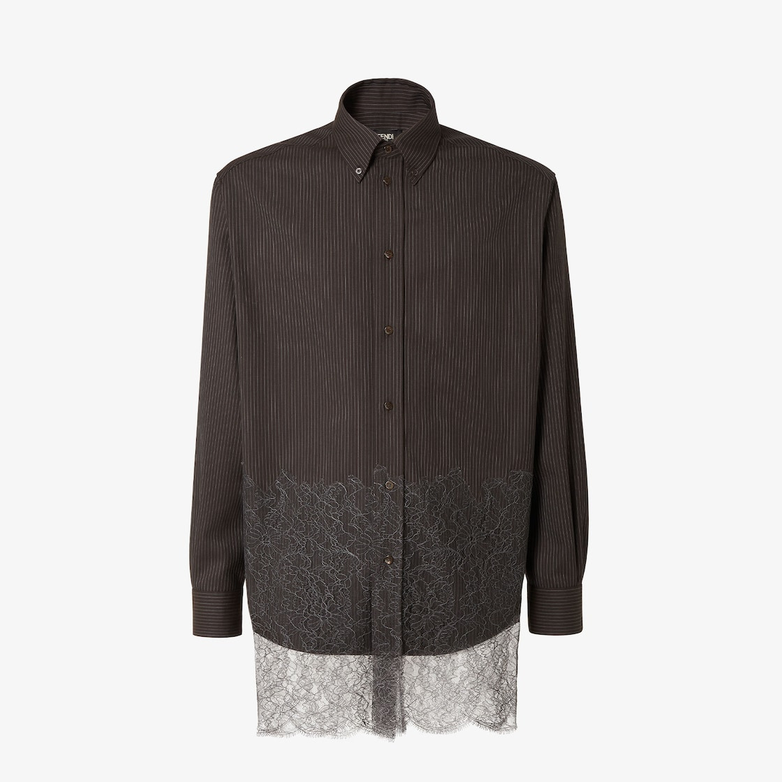 Shirt with button-down collar and long sleeves. Front fastening with visible mother of pearl buttons. Made of black pinstriped wool. Finished with a black lace insert applied at the hem in a double layer effect. Made in Italy Composition: 100% fleece wool, 16 buttons: mother-of-pearl Size worn: 48 IT. The model is 188 cm tall Product Code: FS1332AVK1F0DHP
