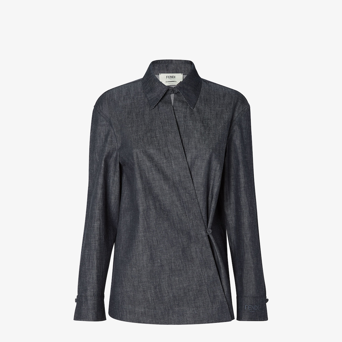 Long-sleeved shirt. Asymmetrical cross-over fastening with small button on the side that creates a teardrop detail on the neckline. Made of ultra-light denim chambray. Customized with a matching embroidered logo at the hem of the left sleeve. Made in Italy Composition: 100% cotton Product Code: FLF830AVF2F0EX7