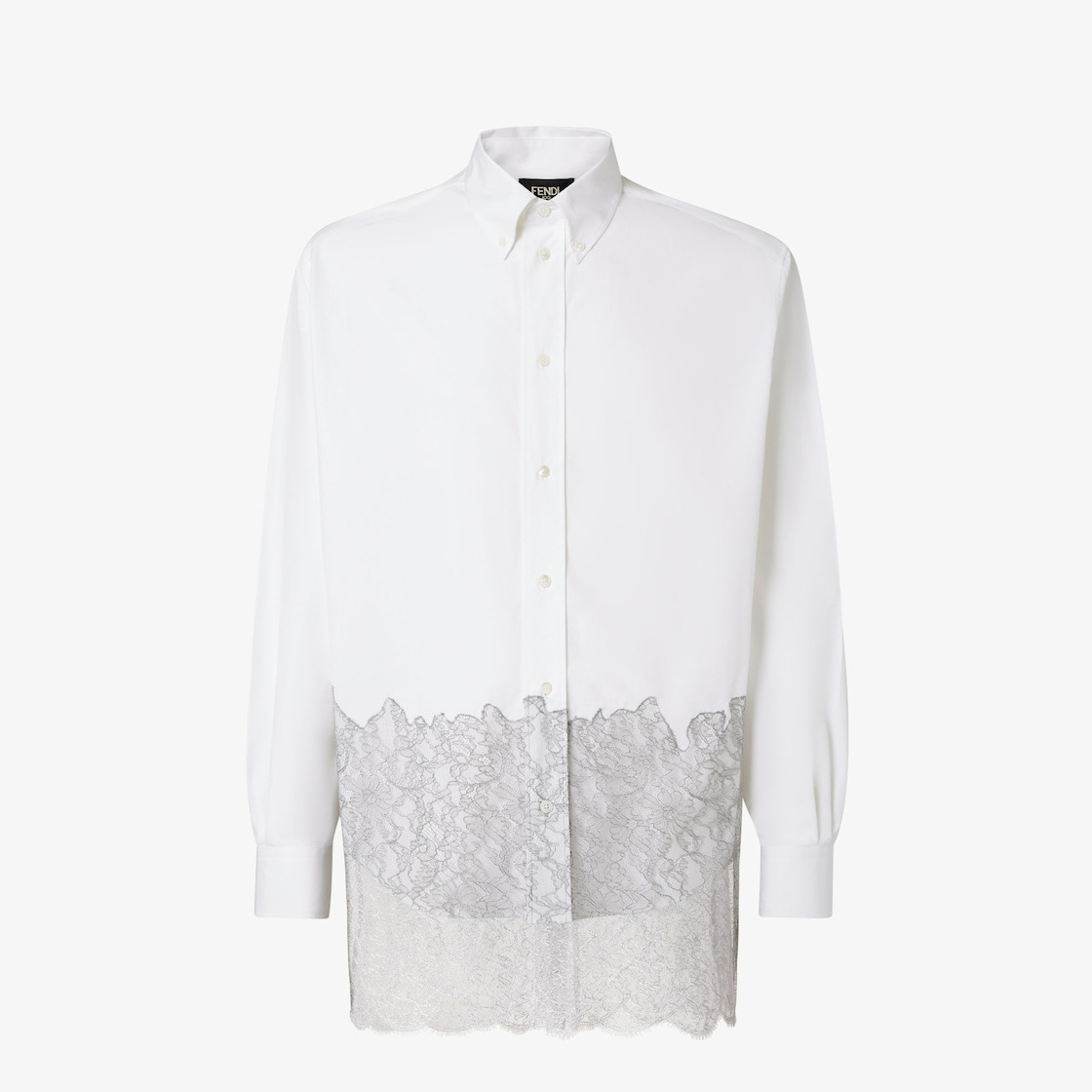 Shirt with button-down collar and long sleeves. Front fastening with visible mother of pearl buttons. Made of white cotton poplin. Finished with a gray lace insert applied at the hem in a double layer effect. Made in Italy Composition: 100% cotton, 51% viscose, 49% polyamide, 16 buttons: mother-of-pearl Size worn: 48 IT. The model is 188 cm tall Product Code: FS1332AVKAF0QA0
