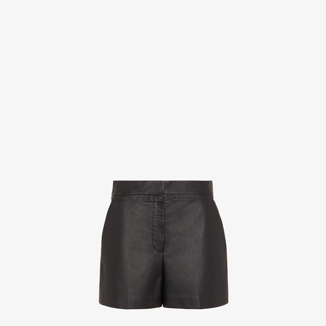 Straight-cut shorts with side slant pockets. Concealed zipper and hook closure. Made of soft black hammered leather. Embellished with embossed Selleria micro stitching at the waist. Made in Italy Composition: 100% deer leather, 100% lamb leather, inside: 100% cupro, tag: 100% silver Size worn: 38 IT. The model is 180 cm tall Product Code: FPP813ARTZF0GME