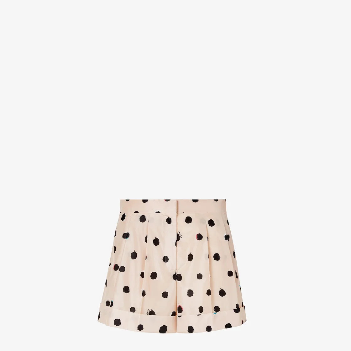 Flared shorts with double pleat on the front. Side pockets and turned-up hem. Concealed zipper and hook closure. Made in a pink taffeta printed all-over with a contrasting color Falena Dots motif. Made in Italy Composition: 100% silk Product Code: FR6690AVJQF1UKB