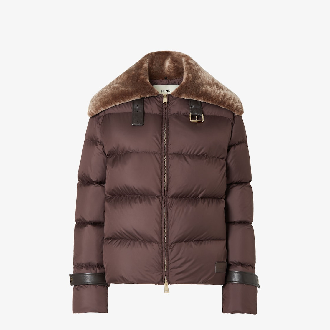 Padded and quilted aviator down jacket. Pockets inserted into the sides and front closure with double-slider zipper. Made with brown technical fabric. The wide collar is finished with a shearling interior and a tone-on-tone leather drawstring closure. Leather toggles with snap buttons on the cuffs and leather Fendi Roma label on the bottom, left side when worn. Palladium-finish metalware. Made in Italy Composition: 100% polyester, 100% calf leather parts, lining: 100% polyamide Product Code: FAN212AT8VF1T6H