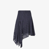 Flared midi skirt with asymmetric hem. Zipper closure on the side. Lined in silk. Made of blue viscose and silk with a burnout patchwork motif that depicts a combination of logos and archive patterns. Made in Italy Composition: 58% viscose, 42% silk, 67% viscose, 33% silk, lining: 100% silk Size worn: 38 IT. The model is 179 cm tall Product Code: FQ7659AUJXF1RX5