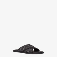 Sandals with cross-over bands and non-slip rubber soles. Made of fabric with jacquard FF motif in black and gray. Embroidered Fendi Roma lettering. Black leather details. Made in Italy Composition: 65% polyamide, 35% cotton, decoration 1: 100% polyester, 100% lamb leather, inside: 100% lamb leather Product Code: 7X1548AJZEF0TUY