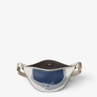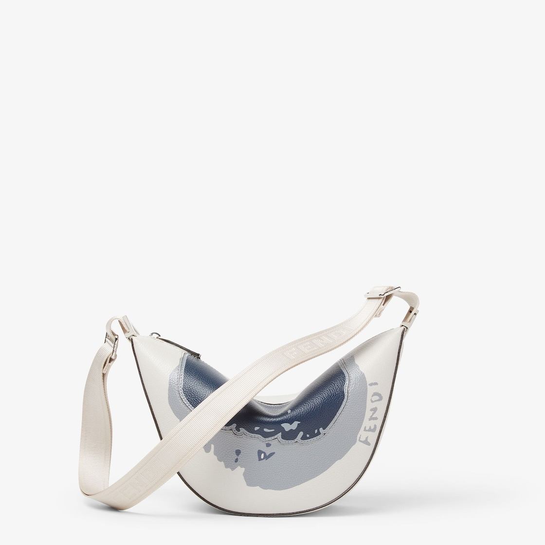 Small Fendi Melon crescent-shaped messenger bag. Made of full-grain light gray leather with a Fendi Macro Dots motif inlaid and printed in dark blue and light gray in a combination of matte and shiny finishes. Decorated with FF metal appliques on the corners. Zipper closure and palladium-finish metalware. Technical fabric adjustable cross-body strap embellished with FENDI lettering. Made in Italy Composition: 100% calf leather, inside: 90% polyester, 10% polyurethane Product Code: 7VA635AVVDF1UT8