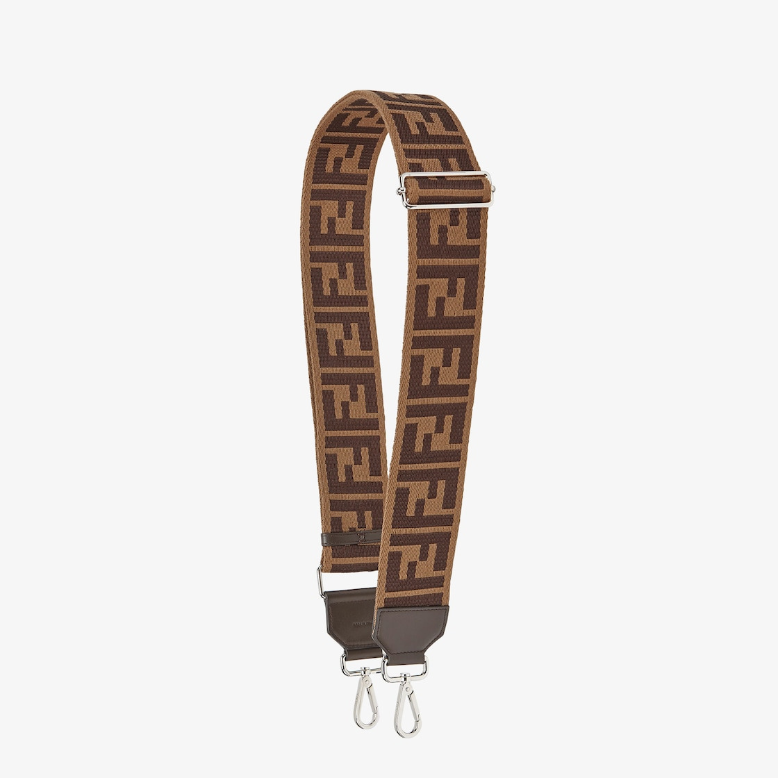 Long adjustable shoulder strap with double clip, to use in combination with any bag with hooks. Made of webbing with brown and tobacco FF motif. Embellished with details in brown leather. Palladium-finish metalware. Made in Italy Composition: 100% polyester, 100% calf leather Product Code: 8AV439AMU7F1CJF