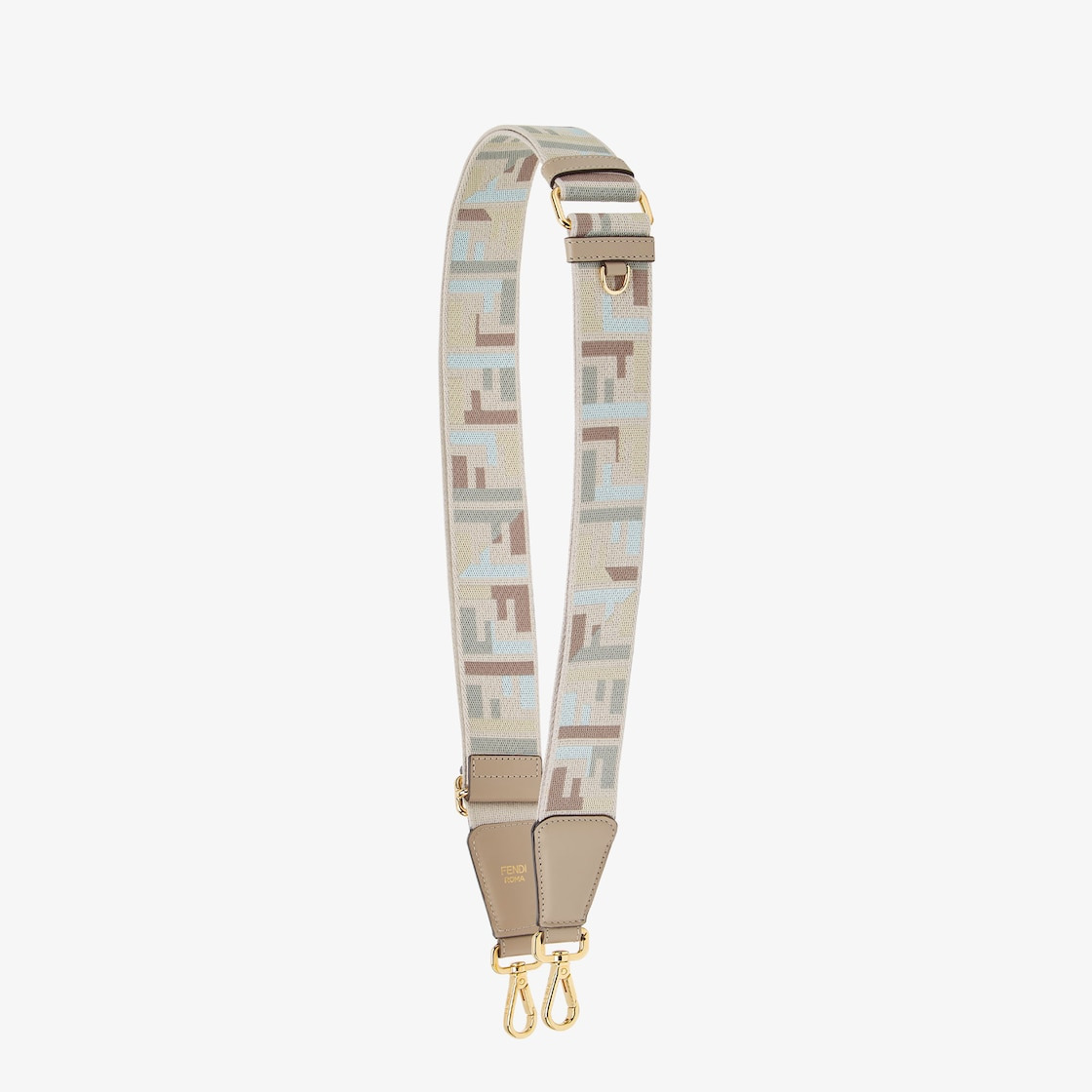 Long adjustable shoulder strap with double clip, to use in combination with any bag with hooks. Made of webbing printed with the multicolored jacquard iconic FF motif. Finished with details in dove gray leather. Gold-finish metalware. Made in Italy Composition: 50% polyamide, 50% polyurethane, 100% calf leather Product Code: 8AV386AUS6F1SKI