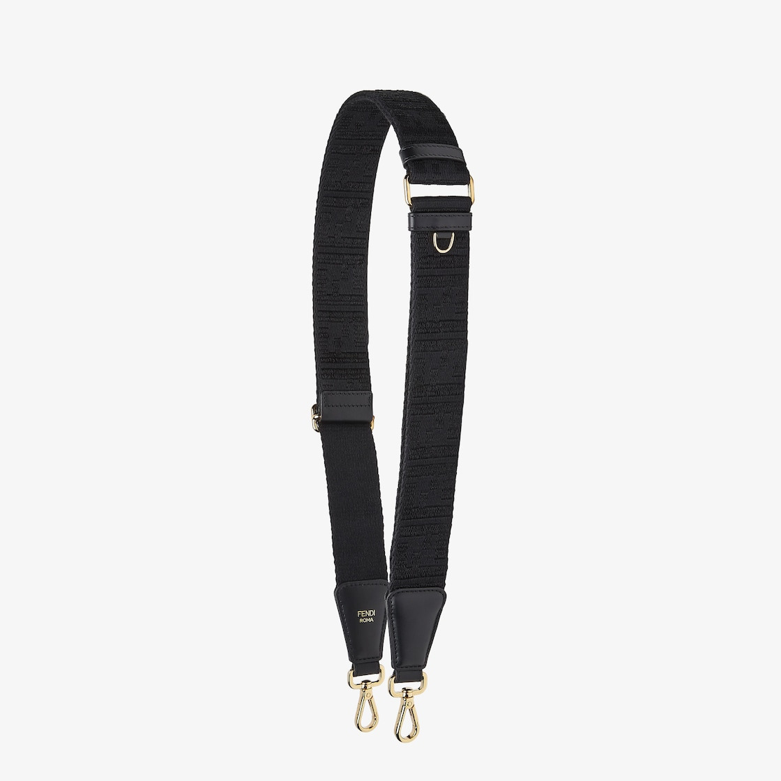 Long adjustable shoulder strap with double clip, to use in combination with any bag with hooks. Made of black webbing with matching tone FF jacquard motif. Black leather details. Gold-finish metalware. Made in Italy Composition: 98% polyester, 2% polyamide, 100% calfskin Product Code: 8AV386AJPEF0KUR