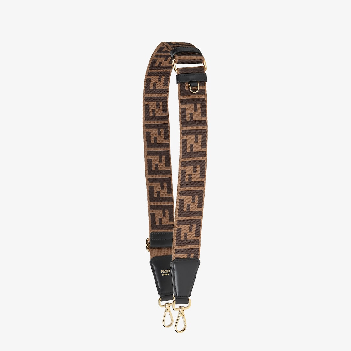 Long adjustable shoulder strap with double clip, to use in combination with any bag with hooks. Made of brown canvas. Embellished with FF motif in gold and brown leather details. Gold-finish metalware. Made in Italy Composition: 98% polyester, 2% polyamide, 100% calfskin Product Code: 8AV386AJPEF1A8N