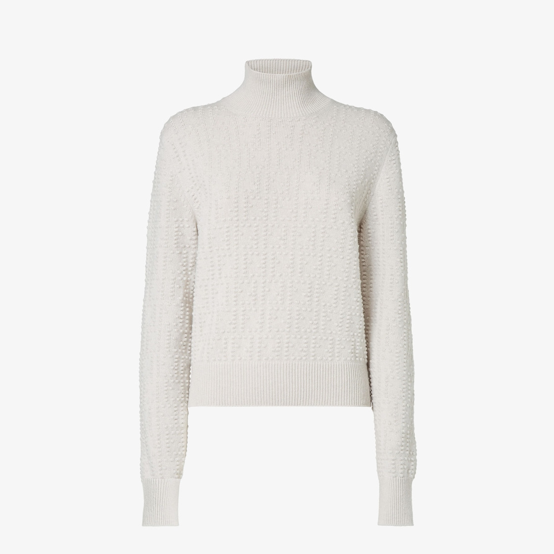 High neck sweater with long sleeves, finished with ribbed edges. Made of light gray wool and cashmere with a tone-on-tone FF motif, interpreted with a polka dot embroidery that creates a slightly raised texture. Made in Italy Composition: 70% wool, 30% cashmere Size worn: 38 IT. The model is 178 cm tall Product Code: FZXE09AYM0F16A8