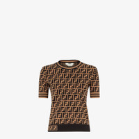 Short-sleeved close-fitting sweater. It has a ribbed finish, a crew neck and small side slits. Made of knitted viscose with black and brown FF motif. Black ribbed edges with contrasting-colored FF. Made in Italy Composition: 67% Viscose, 33% Polyester Fit: Slim Product Code: FZY702A5QGF118W