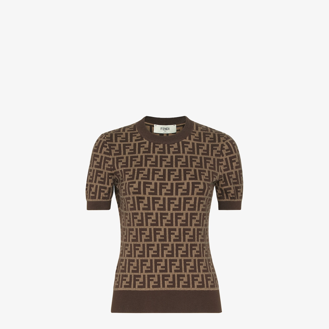 Slim-fit sweater. Crew neck and short sleeves. Made of a jacquard cotton knit with iconic brown FF motif. Trimmed with solid-colored ribbed edges. Made in Italy Composition: 100% cotton Size worn: 38 IT. The model is 178 cm tall Product Code: FZXC72ASJTF0GGE