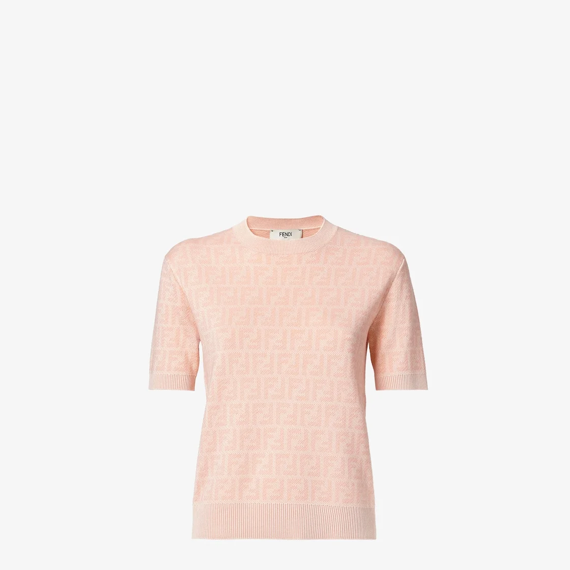 Fitted short-sleeved crew-neck sweater. Made of a light pink wool and silk yarn jacquard with the iconic FF motif all over. Finished with ribbed edges. Made in Italy Composition: 100% wool Product Code: FZXE50AYM1F1UKC
