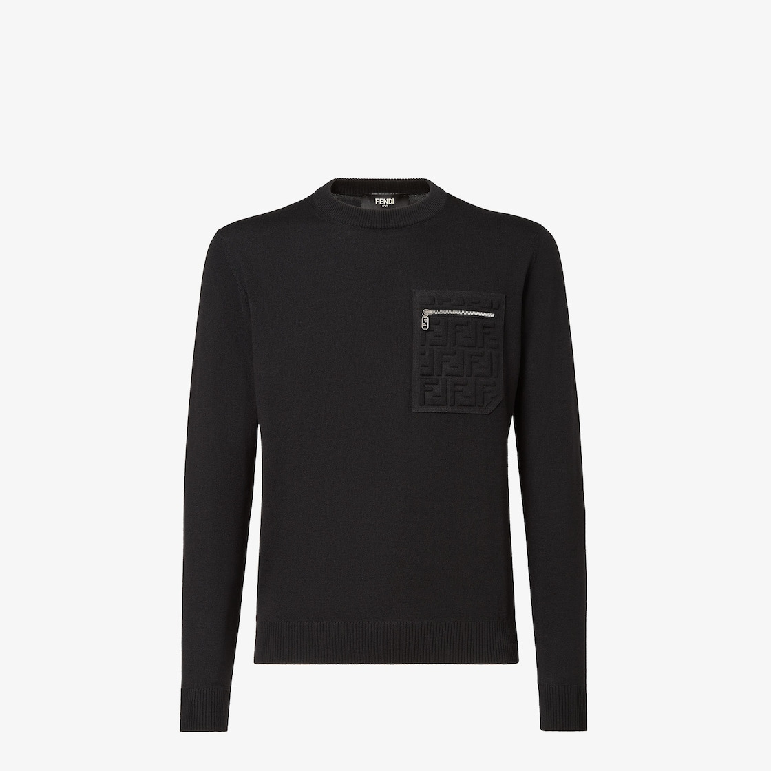 Long-sleeved crew-neck sweater. Regular fit. Made of black wool yarn. The zipped breast pocket is embellished with a tone-in-tone embossed FF and palladium-finish Fendi O’Lock metal slider. Made in Italy Composition: 100% fleece wool, 1 button: mother-of-pearl Fit: Regular Product Code: FZE035ATMOF0QA1