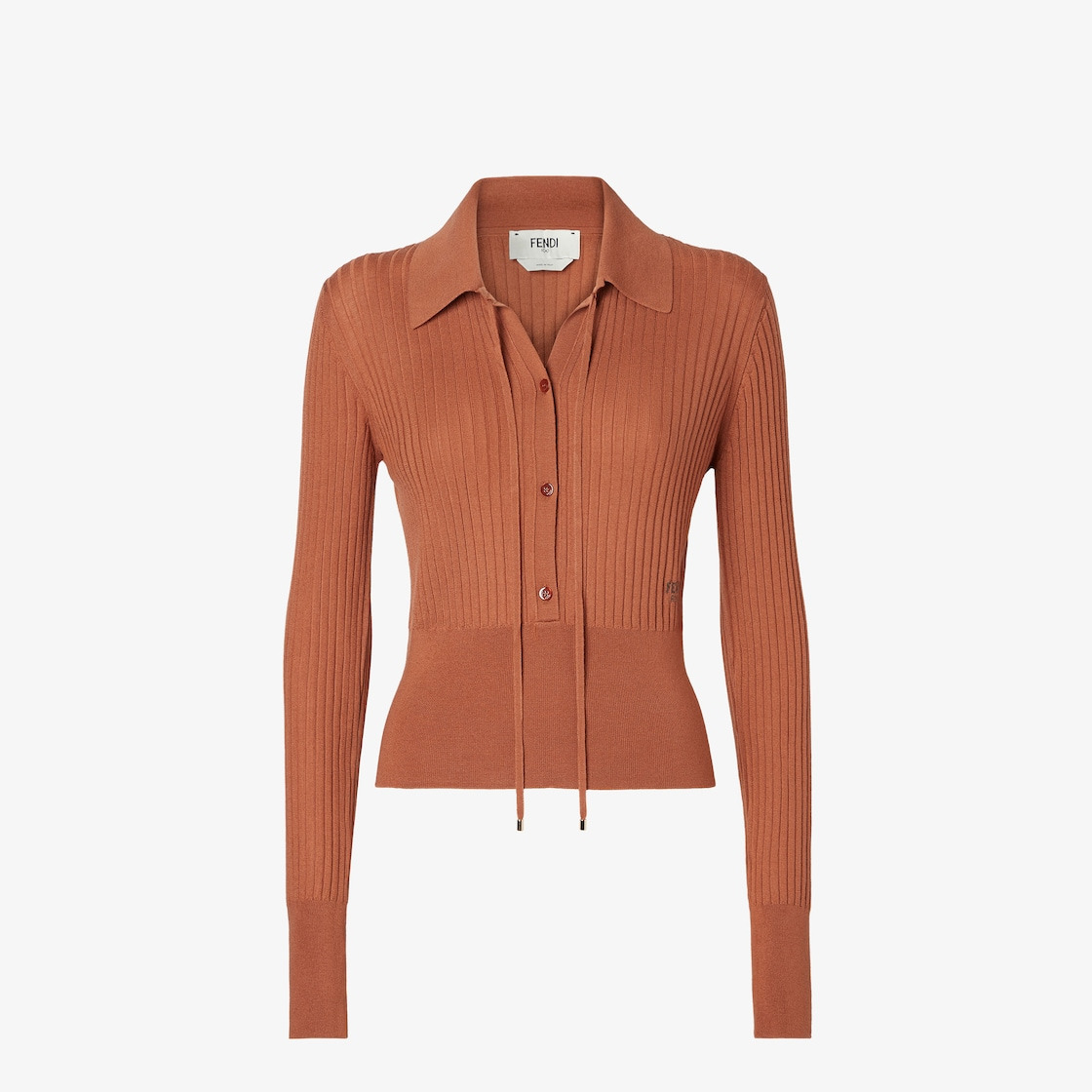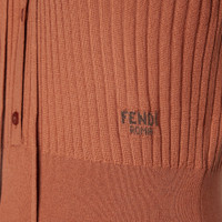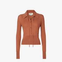 Slim-fitting sweater inspired by an archive sketch by Karl Lagerfeld. Deep V-neck, polo collar with self-ties to fasten in a bow and long sleeves with wide cuffs. Made of a lightweight rust-colored wool jersey. Finished with tone-on-tone Fendi Roma logo intarsia. Made in Italy Composition: 100% wool, 4 buttons: mother of pearl Product Code: FZXD75AUZTF1T6K