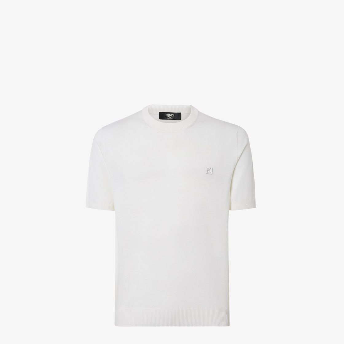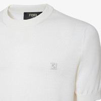 Short-sleeved, crew-neck sweater. Ribbed edges. Made of white wool yarn. Customized with a small palladium-metal FF logo applied on the chest. Made in Italy Composition: 98% fleece wool, 2% elastane, 1 button: mother of pearl Size worn: 48 IT. The model is 186 cm tall Product Code: FZY443AU84F0QA0