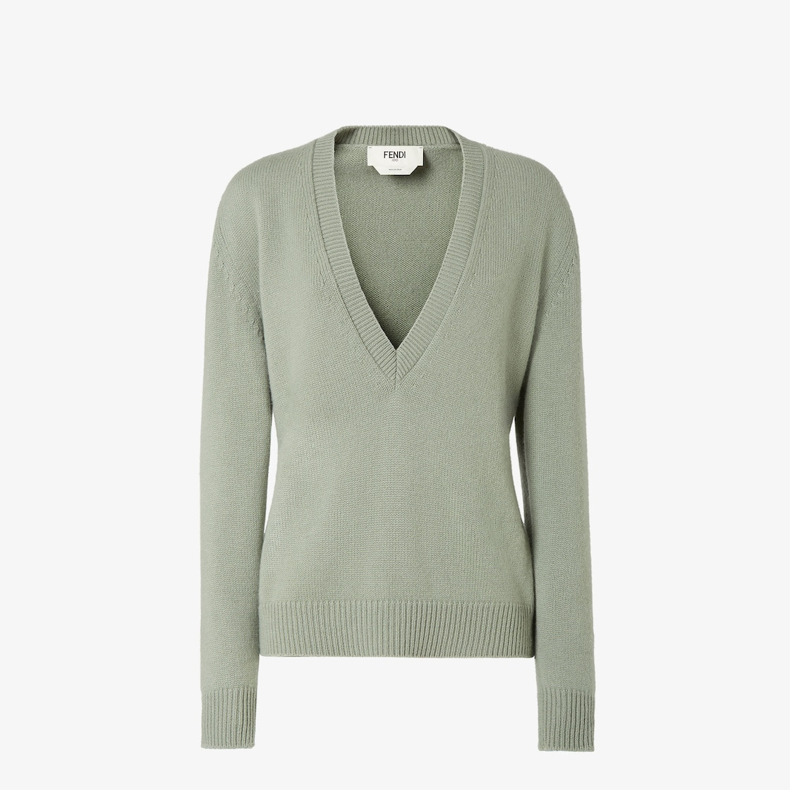 Oversized pullover with ribbed elastic waistband insert on the back. Deep V-neck and long sleeves with dropped shoulders. Made of sage green cashmere jersey. Finished with ribbed edges and matching Fendi Roma logo embroidered on the left side. Made in Italy Composition: 100% cashmere Product Code: FZXD89AYLSF1T6E