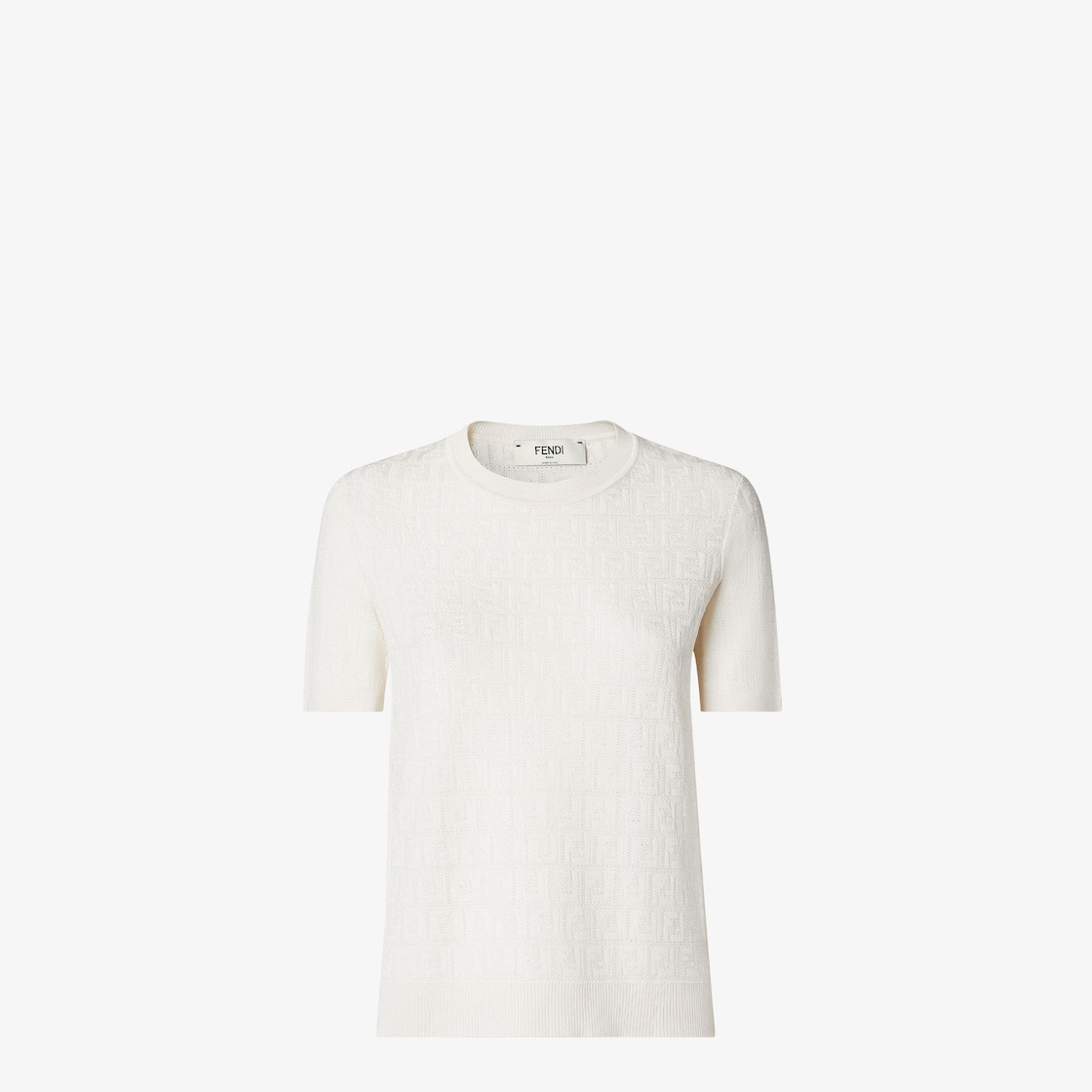 Short-sleeved crew-neck sweater. Made in a white cotton and viscose yarn with an all-over FF motif intarsia. Made in Italy Composition: 54% cotton, 46% viscose Size worn: 38 IT. The model is 179 cm tall Product Code: FZXD57AUZRF0ZNM