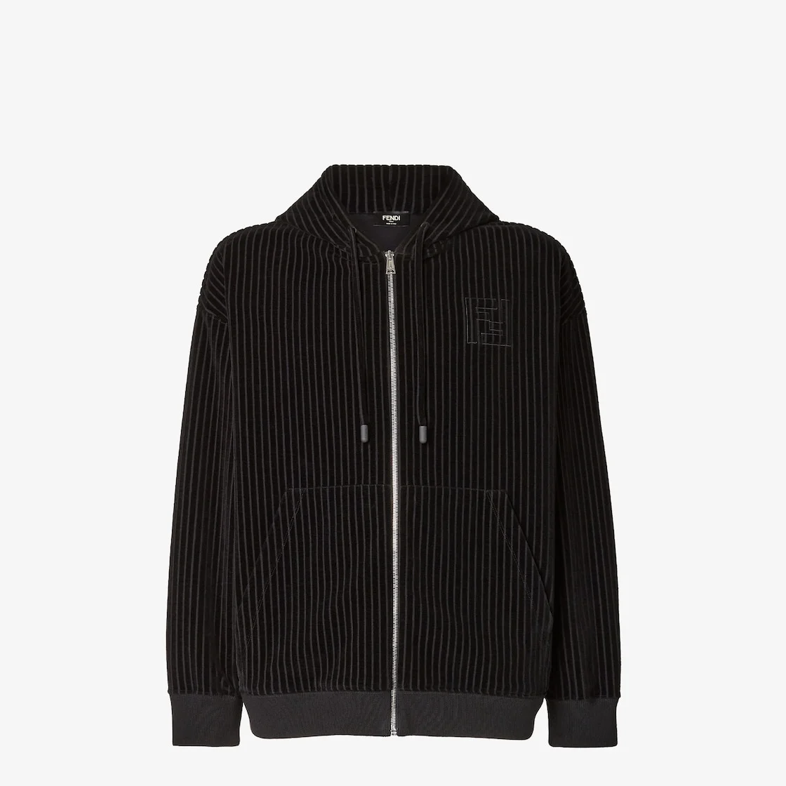 Sweatshirt with drawstring hood. Low-set long sleeves and front pouch pocket. Stretch rib-knit cuffs and hem. Zipper closure. Made of black corduroy. Embellished with a matching embossed FF detail on the chest. Palladium-finish metalware. Made in Italy Composition: 100% cotton Product Code: FY3948AW17F0QA1