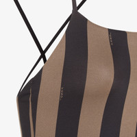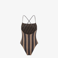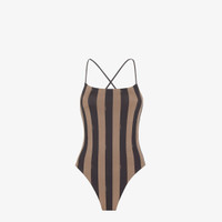 Reversible one-piece swimsuit with a straight neckline and crossover shoulder straps on the back. Made of Lycra® with iconic brown Pequin stripes. FF lining in the same colors. Made in Italy Composition: 82% polyamide, 18% elastane, lining: 82% polyamide, 18% elastane Product Code: FXBA27AQBYF13IZ