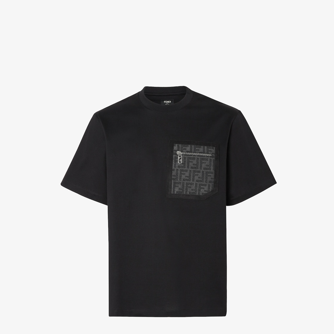 Skater-style T-shirt with zipper pocket on the chest. Crew neck and short sleeves. Made from black cotton jersey. The breast pocket is embellished with a jacquard FF fabric insert and leather trim in the same colors. Made in Italy Composition: 100% cotton, buttons: 100% mother of pearl Fit: Over Size worn: 48 IT. The model is 188 cm tall Product Code: FY1257APM4F0QA1